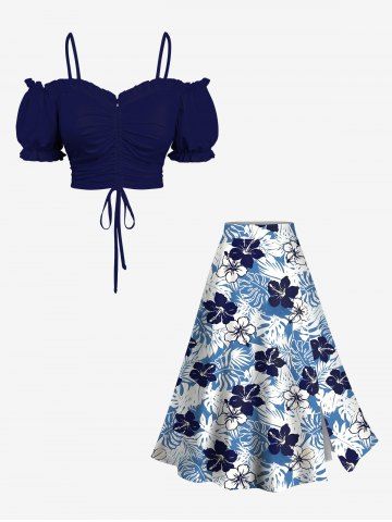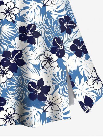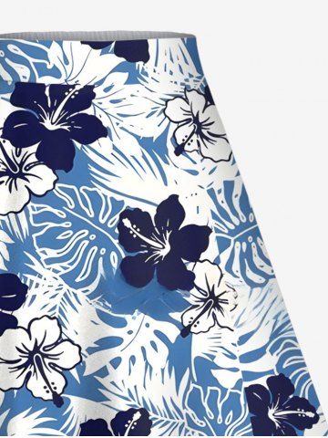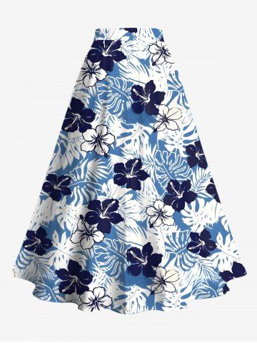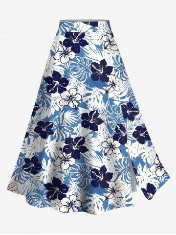Jupe Trapèze Fendue Florale Feuille Tropicale Imprimée de Grande Taille - Bleu - Bleu