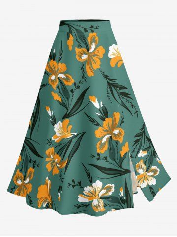 Jupe trapèze fendue hawaïenne à imprimé fleurs et feuilles grande taille - Vert Profond - 2x
