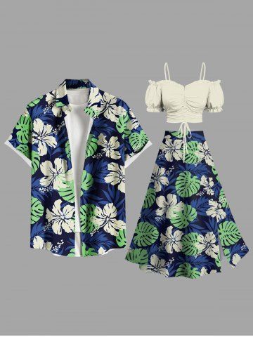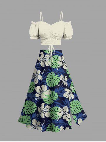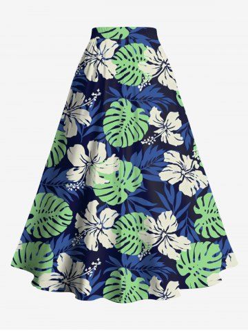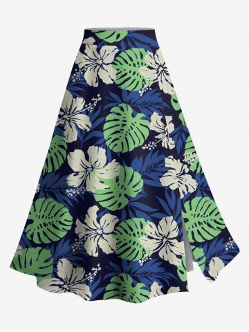 Jupes Graphiques > Jupe trapèze fendue hawaïenne grande taille à imprimé feuilles tropicales et fleurs d'hibiscus