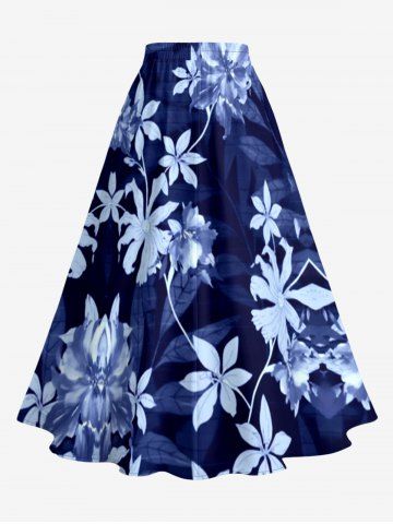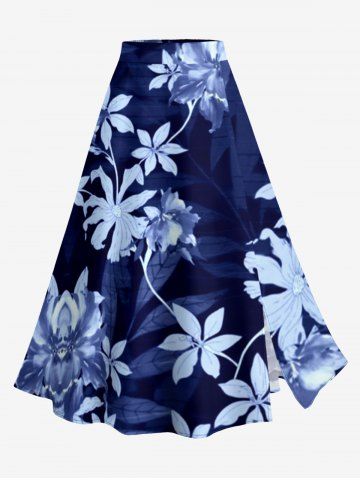 Plus Size Flower Leaf Branch Print Hawaii Split A Line Skirt - Bleu Profond - 6x