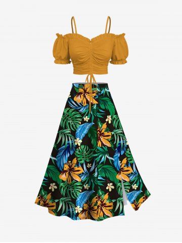 Plus Size Flower Tropical Leaf Print Split Hawaii Skirt - Vert Profond - 6x