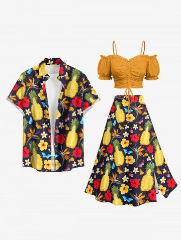 Plus Size Pineapple Hibiscus Flower Butterfly Print Hawaii Split A Line Skirt - Brun Doré - S