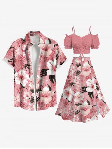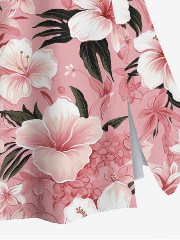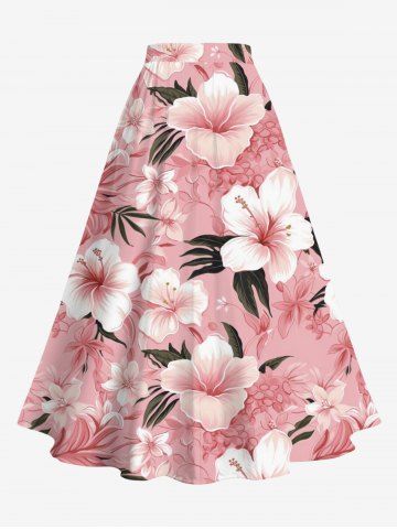 Plus Size Tropical Leaf Hibiscus Flower Print Hawaii Split A Line Skirt - Rose Clair - Rose Léger