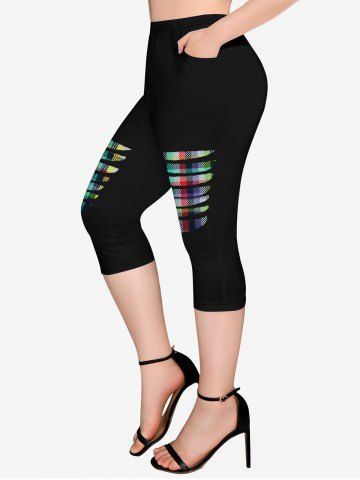 Legging Capri 3D Déchiré Imprimé à Carreaux de Grande Taille avec Poches - Noir - Noir
