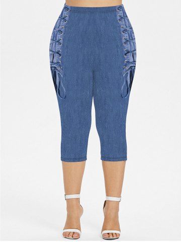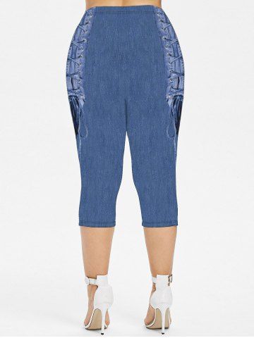 Legging Capri 3D Jean Imprimé de Grande Taille à Lacets avec Œillet - Bleu - Bleu