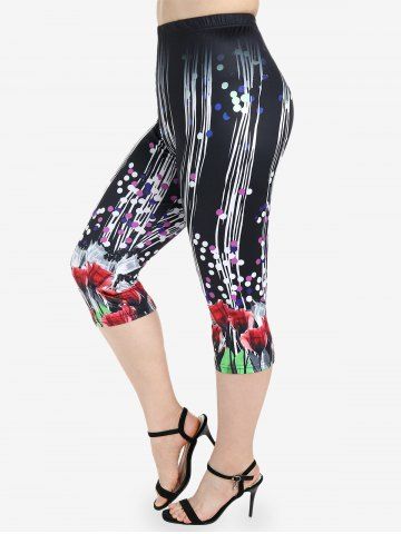 Legging Corsaire à Imprimé Fleuri à Taille Haute de Grande Taille à Pois - Noir - Noir