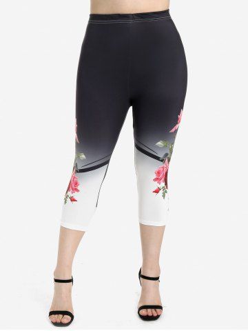 Legging Corsaire à Imprimé Rose en Blocs de Couleurs à Taille Haute de Grande Taille - Noir - Noir