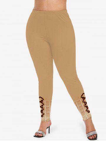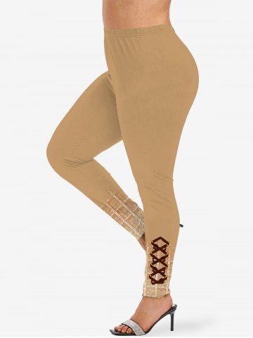 Legging Moulant 3D Peinture Eclaboussée Imprimée à Carreaux de Grande Taille à Lacets - Café Lumière - 3x