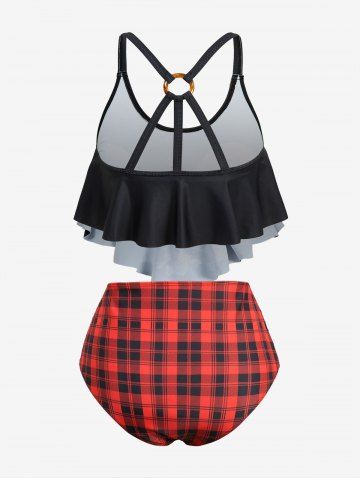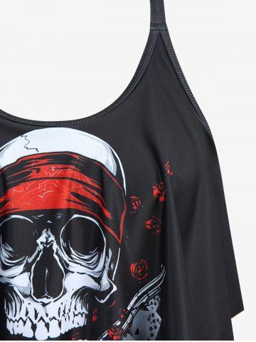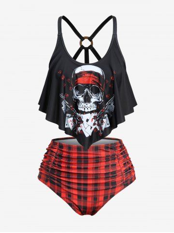 Skull Rose Flower Poker Plaid Print Ruched Bottom Tankini Swimsuit - Noir - Noir