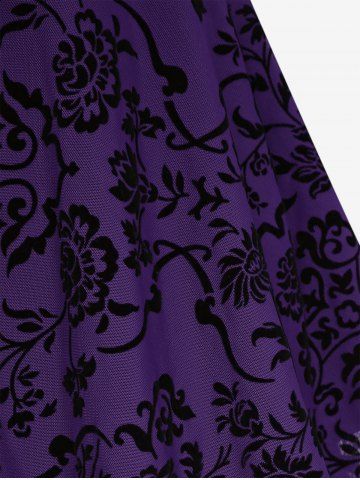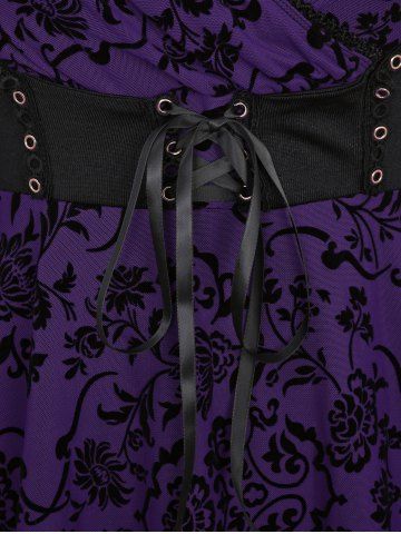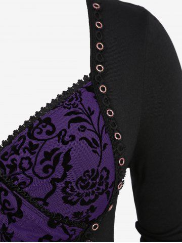 Plus Size Floral Mesh Flocking Lace Up Lace-trim Grommet 2 in 1 Long Sleeves Corset Top