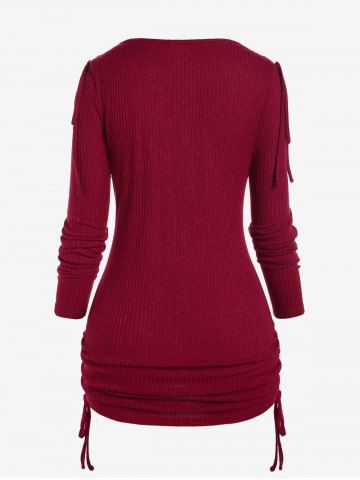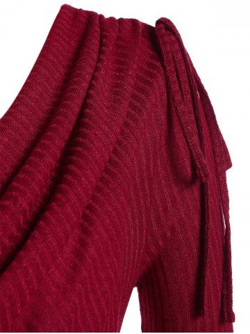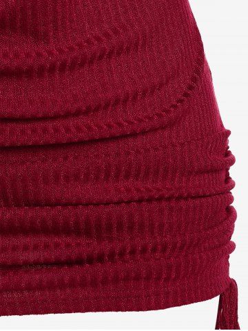 m*****45Plus Size Cowl Neck Rib-knit Cinched Ruched TopColor: DEEP RED Size: 1X | US 14-16Received this dark red ladies cowl neck light weight sweater. It fits true to size. I like how you can pull on the bottom strings to tighten or loosen the bottom. There are also ties at the shoulder on each side.