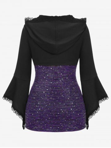 Plus Size Lace Trim Chains Textured Ruched Bell Sleeves Hooded T-shirt