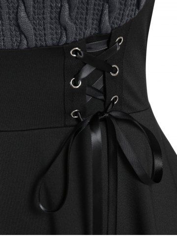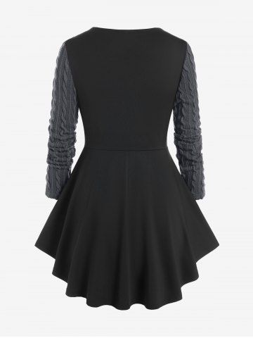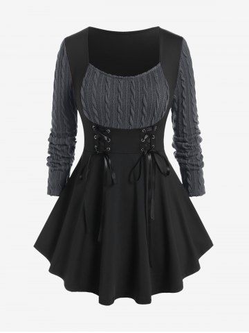 T-shirt à lacets en maille torsadée grande taille, matières mixtes - Gris Foncé - Gris Foncé