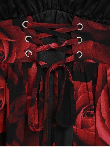 T-shirt en Mousseline Plissée Imprimé de Rose et Manches Evasées - Rouge Foncé - L | Us 12