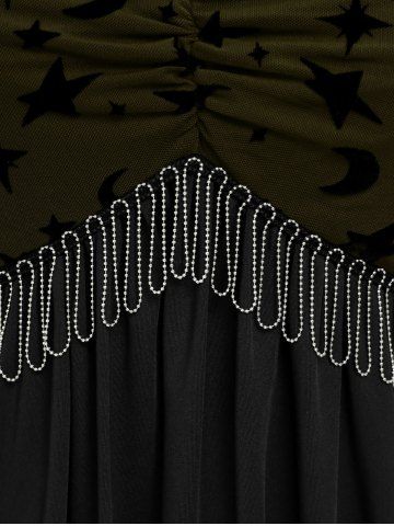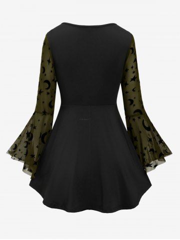 Manches Longues > T-shirt manches longues à imprimé gothique lune et étoiles, grande taille, empiècement en maille, manches cloche, chaîne froncée et pompon