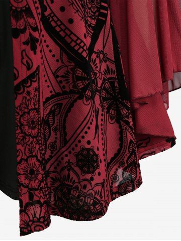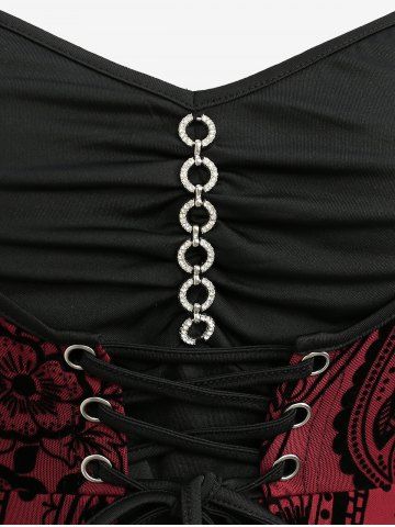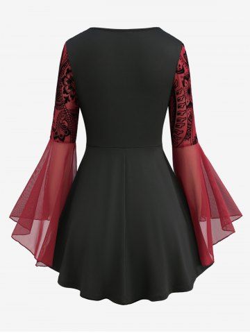 Haut Brillant Fleuri en Maille à Manches Evasées Grande Taille à Lacets - Rouge Foncé - 1x | Us 14-16
