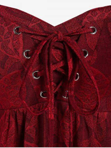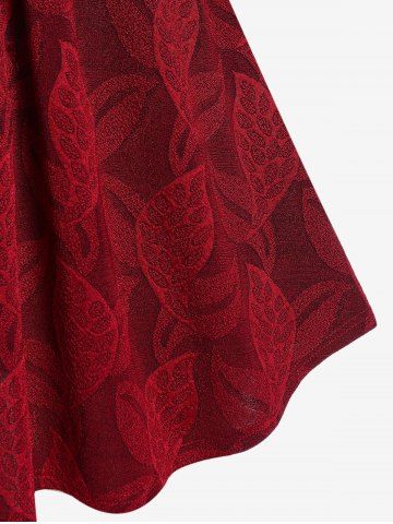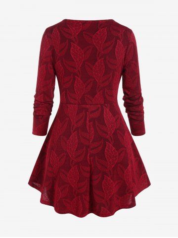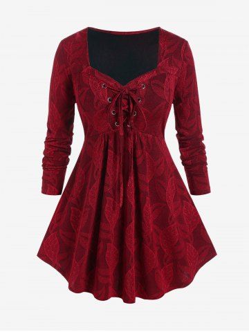 T-shirt Tunique Motif de Feuille de Grande Taille à Manches Longues à Lacets - Rouge - Rouge