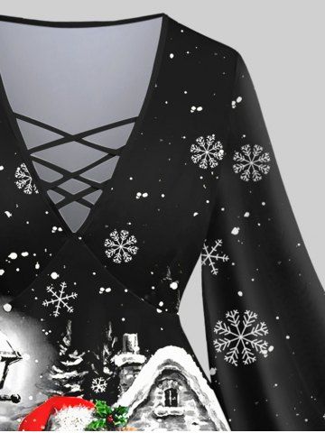 T-shirt Père Noël Lumière et Ours Imprimés en Treillis de Grande Taille - Noir - Noir