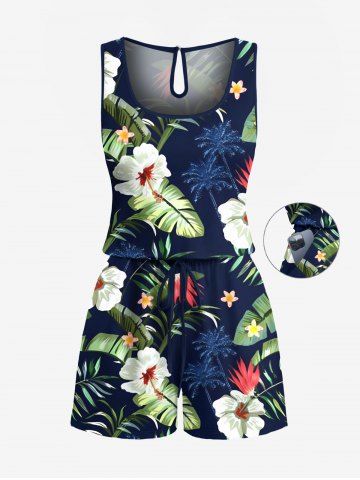 Combinaison grande taille à imprimé cocotier, feuilles tropicales, hibiscus, fleurs, hawaïen, cordon de serrage, poches - Bleu Profond - 1x