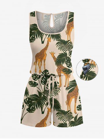 Combinaison grande taille à imprimé girafe et feuilles tropicales, style hawaïen, avec cordon de serrage et poches. - Café Lumière - Xxs