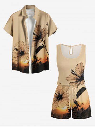 Combinaison grande taille à imprimé hibiscus dégradé coucher de soleil hawaïen avec cordon de serrage et poches - Café Lumière - 5x