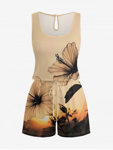 Combinaison grande taille à imprimé hibiscus dégradé coucher de soleil hawaïen avec cordon de serrage et poches - Café Lumière - 6x