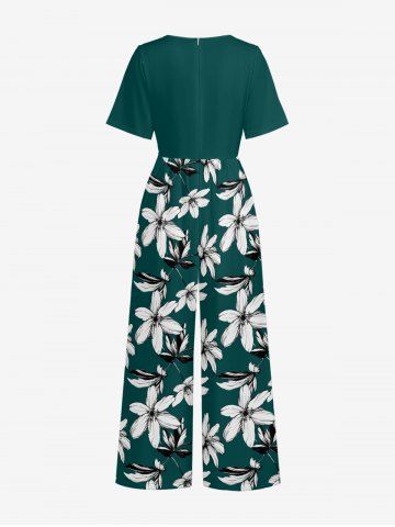 Combinaison hawaïenne à imprimé fleurs et feuilles, col en V et jambes larges - Turquoise Foncée - L