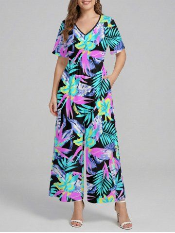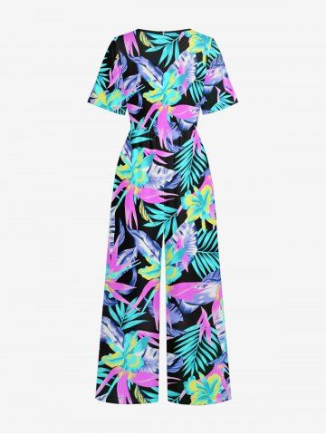 Pantalons Graphiques > Combinaison hawaïenne à jambes larges et col en V, imprimée de feuilles tropicales et de fleurs d'hibiscus