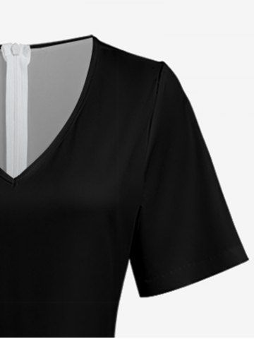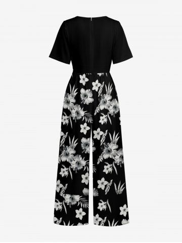 Combinaison hawaïenne à jambes larges et col en V, imprimée de feuilles tropicales et de fleurs d'hibiscus - Noir - Noir
