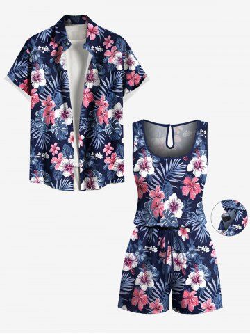 Pantalons Graphiques > Combinaison hawaïenne cintrée grande taille à imprimé feuilles tropicales et fleurs d'hibiscus