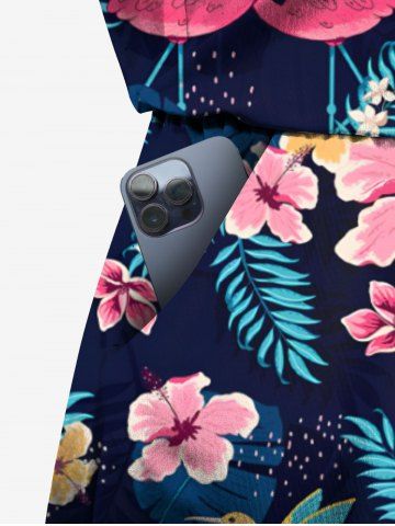 Combinaison hawaïenne cintrée grande taille à imprimé flamant rose et feuilles tropicales - Bleu Profond - 5x
