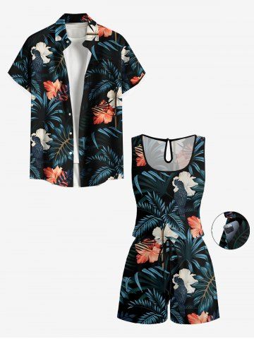 Combinaison hawaïenne grande taille à imprimé de feuilles tropicales et d'hibiscus, avec cordon de serrage et poches. - Vert Profond - Xxs