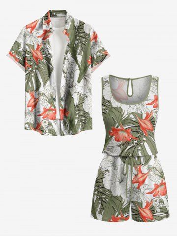 Combinaison hawaïenne grande taille à imprimé de feuilles tropicales et d'hibiscus, avec cordon de serrage et poches. - Vert Clair - Vert Clair