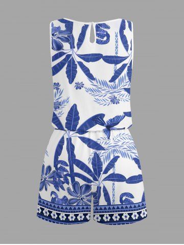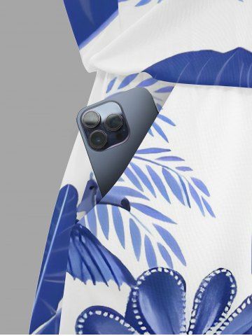Combinaison hawaïenne grande taille à imprimé tropical feuille de cocotier bleu et blanc style porcelaine avec cordon de serrage et poches - Bleu - Bleu
