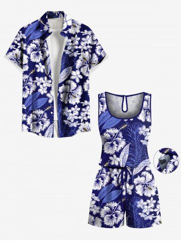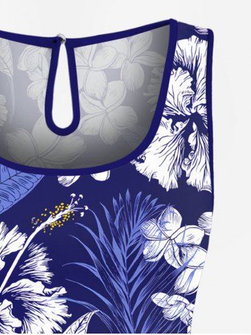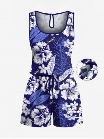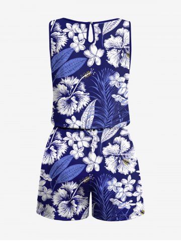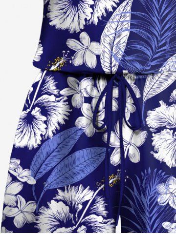 Combinaison Sanglée Fleur Feuille Tropicale Imprimée de Grande Taille - Bleu Profond - 3x
