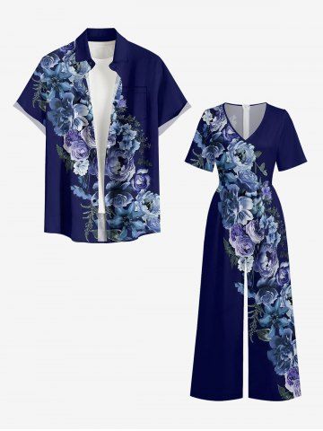 Flower Leaf Print Hawaii Wide Leg Jumpsuit - Bleu Profond - Xs