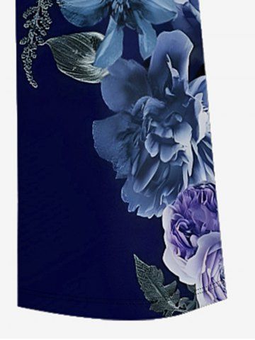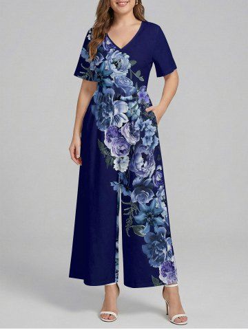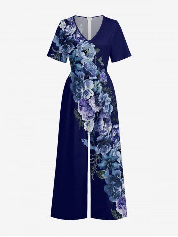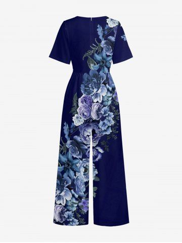 Flower Leaf Print Hawaii Wide Leg Jumpsuit - Bleu Profond - M