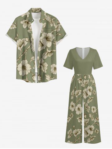 Flower Print Hawaii Wide Leg Jumpsuit - Vert Clair - Vert Clair