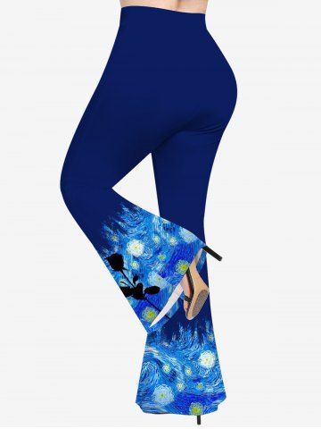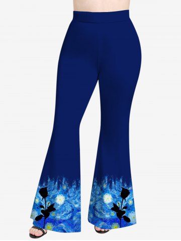 Pantalon Évasé à Imprimé Peinture de Rose Spirale Grande-Taille - Bleu Ciel - Bleu Ciel