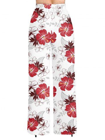 Pantalon hawaïen à jambes larges, imprimé fleurs d'hibiscus, cordon de serrage, grande taille - Blanc - Blanc