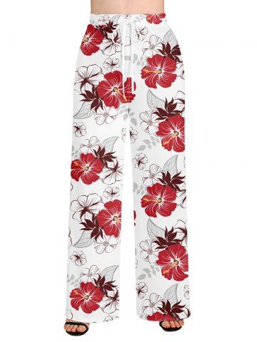 Pantalon hawaïen à jambes larges, imprimé hibiscus, grande taille et cordon de serrage - Blanc - Blanc