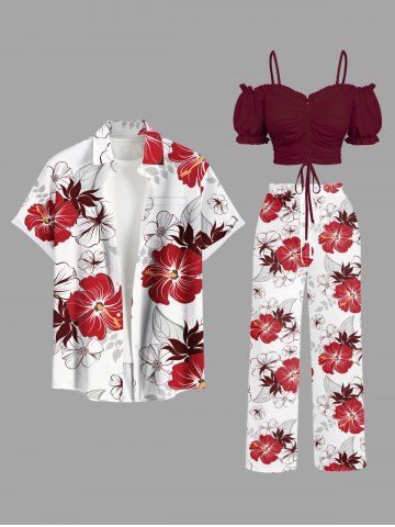 Pantalons Graphiques > Pantalon hawaïen à jambes larges, imprimé hibiscus, grande taille et cordon de serrage