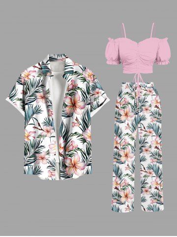 Pantalon hawaïen à jambes larges, imprimé tropical fleurs et feuilles, grande taille, cordon de serrage, avec cordon de serrage. - Blanc - Blanc