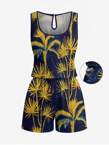 Plus Size Coconut Tree Plant Print Hawaii Drawstring Pocket Romper - Cadetblue - M