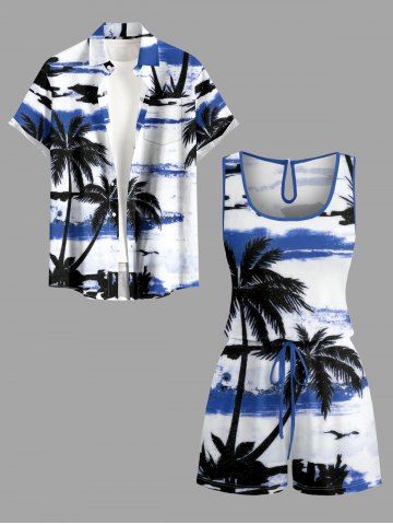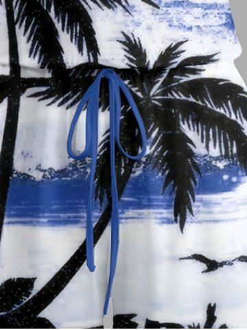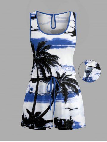 Plus Size Coconut Tree Sea Print Hawaii Drawstring Pocket Romper - Bleu - Bleu