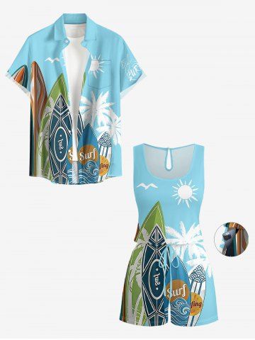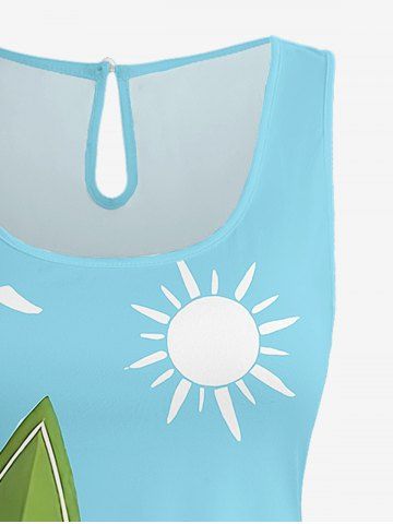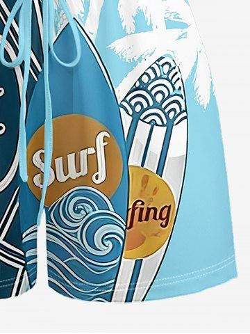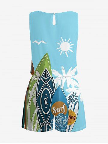 Plus Size Coconut Tree Sun Surfboard Sea Waves Print Hawaii Drawstring Pocket Romper - Bleu Clair - Bleu Clair