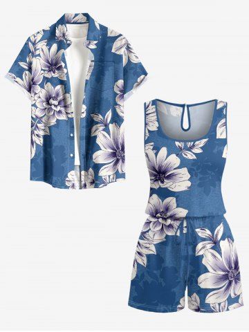 Plus Size Flower Leaf Print Hawaii Drawstring Pocket Romper - Bleu - Bleu