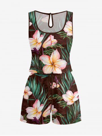Plus Size Flowers Tropical Leaf Print Cinched Hawaii Romper - Café Profond - 3x