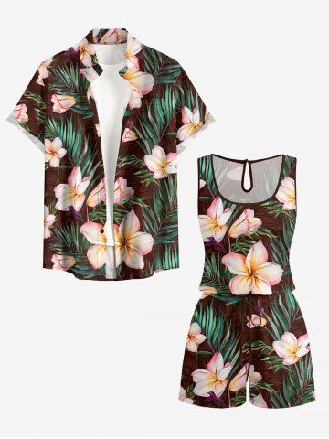 Plus Size Flowers Tropical Leaf Print Cinched Hawaii Romper - Café Profond - 5x