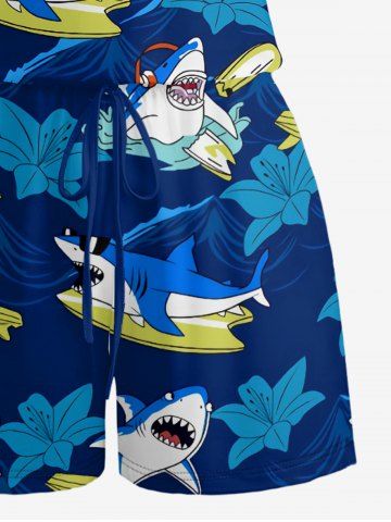 Plus Size Shark Sea Waves Hibiscus Flower Print Hawaii Drawstring Pocket Romper - Bleu Profond - 2x